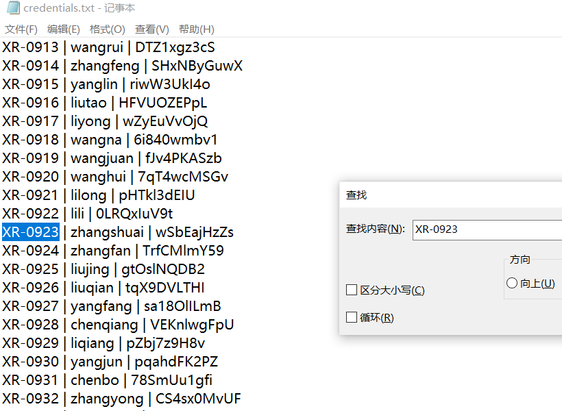 internal-secret里有一个文本,里面是一堆账号信息,从里面找到XR-0923的