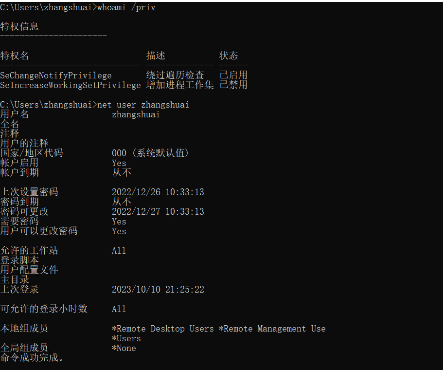 RDP上XR-0923的时候发现这个用户属于Remote Desktop Users和Remote Management Users组所以能evil-winrm上去,感觉用这个连上去权限高点?怎么多了一些特权