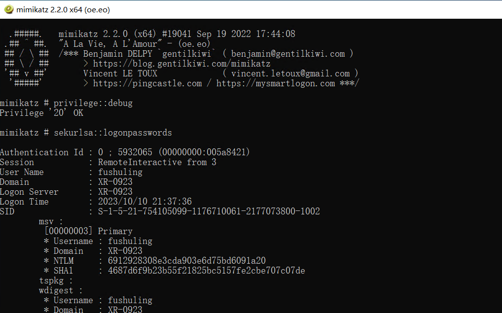 难绷的是我改完名之后改不回来了,可能得用zhangshuai用户改,不过也不影响后面继续打,抓一下密码(必须用2.2的,不然会报错)
