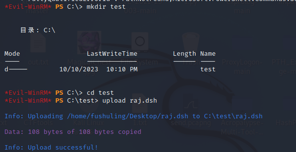 然后切换到C目录,然后创一个test文件夹切换过去(不然后面会没权限),把本地的raj.dsh上传上去