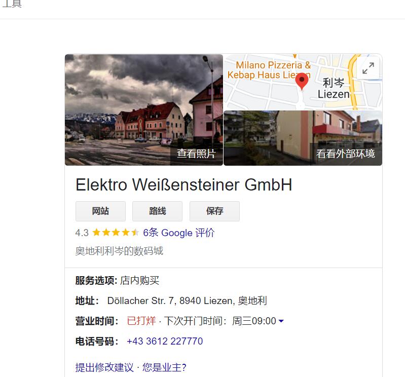 这张图一眼欧洲国家,但很难看出是哪个欧洲国家,然后到了考察视力和联想的时候,看出旁边那个建筑物的名字是Elektro Weibensteiner,然后直接谷歌就得到答案