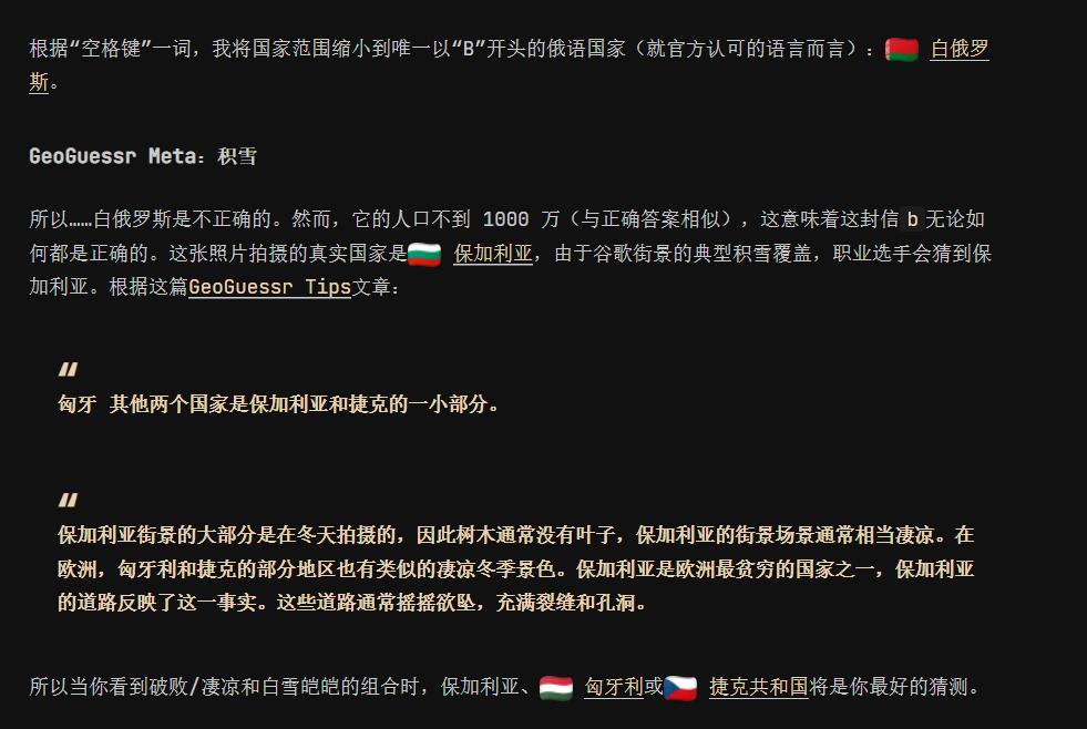 整体风格像某个欧洲国家,而且房屋上还有雪,我搜了一下旁边垃圾桶上的KMA,没有什么发现。看了大佬的wp,他们队做到这里就已经猜到,flag是break me spacebar了,因为这是geoguesser社区的一个很流行的模因,讲的是Rainbolt猜地图位置时是怎么大力的敲击自己键盘上的空格键,然而这个梗似乎只在国外流行,我反正完全不知道,所以他们开始思考某个b开头的国家,先猜了白俄罗斯,但因为那个国家人口不足,所以被排除了,但他们做到这里也只需要直接嗯猜flag即可,毕竟flag是啥他们都知道了,所以当时也没有深挖这里到底是哪里,但最后留下了某个geogusser社区大神的文章,得知了这里是保加利亚Bulgaria:(GeoGusser Tips)
