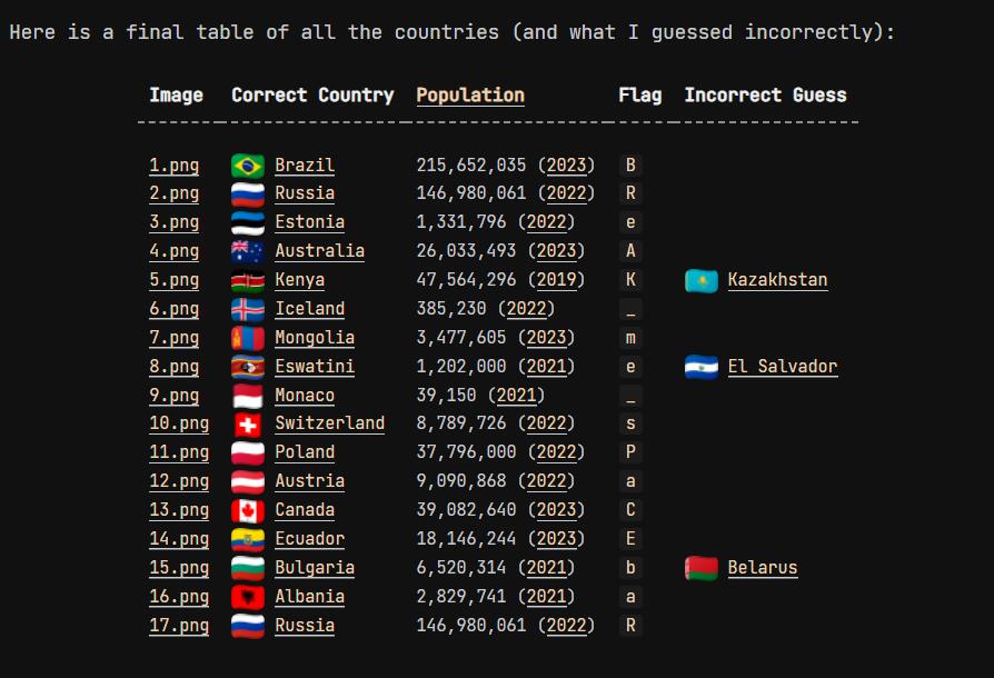 简单来说就是让我们按照规则将最后的结果拼凑成flag,每个国家名称的第一个字母将用来创建flag,人口超过1000万使用大写字母,人口不足100万的国家成为_,所以README里的那个最后的flag就是idek{TEST_flAg},下面就让我们来看看这些让人难绷的图片们吧