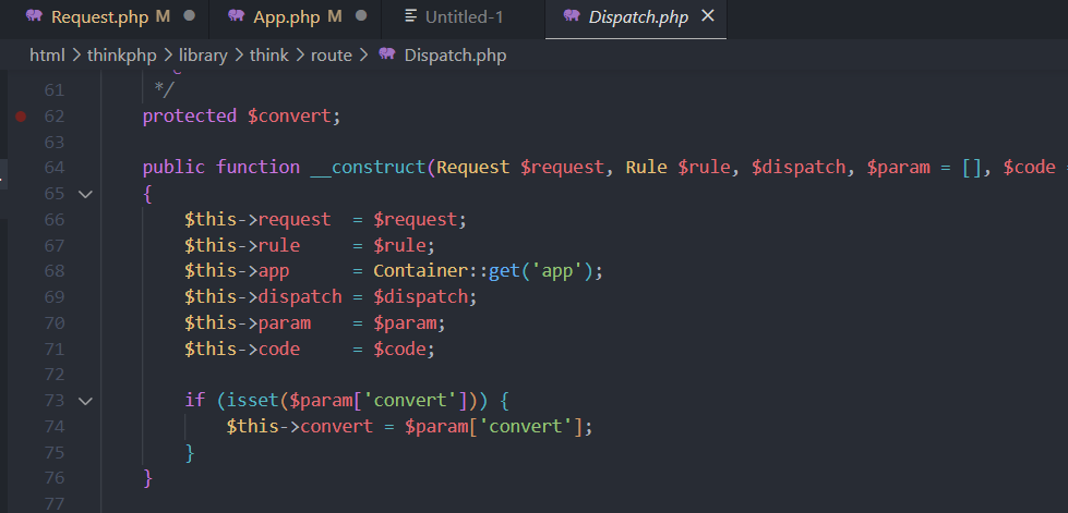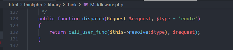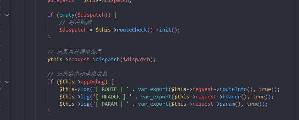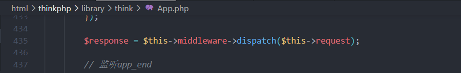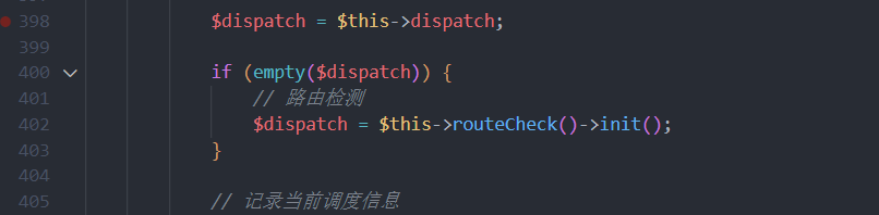 这时我们才将$dispatch = $this->routeCheck()->init();执行完,回到App.php,在435行这里调用了dispatch方法