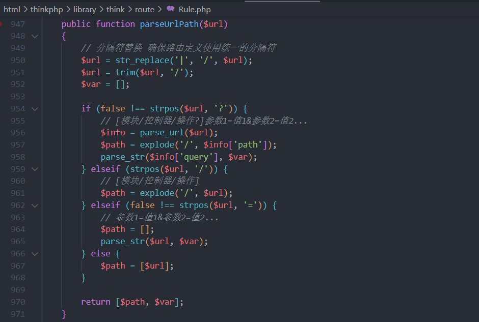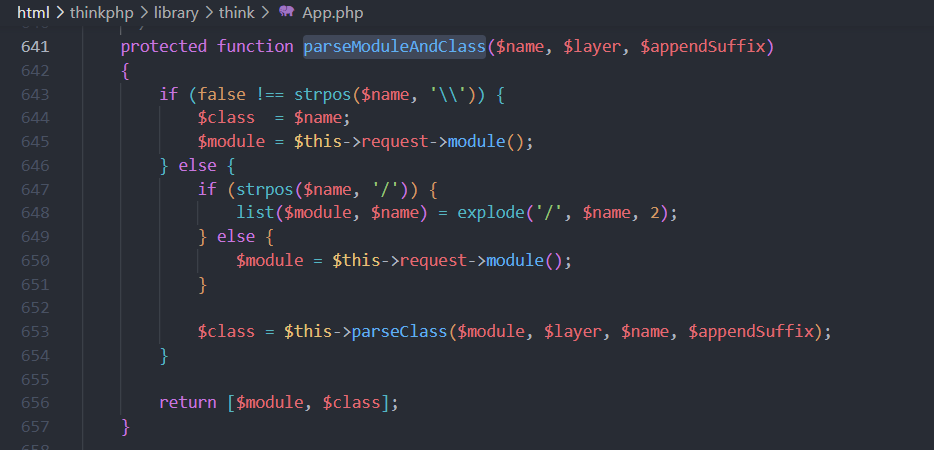 我们再跟进一下parseUrlPath方法,这个方法对分割符进行了替换,按照0是模块,1是控制器,2是操作,所以我们的$url变成了index|\think\app|invokefunction。
