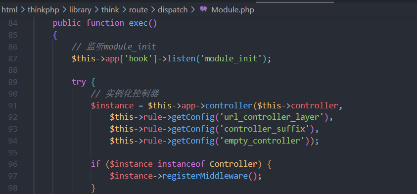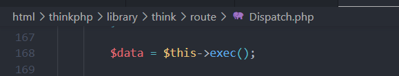 一直跟进,会在dispatch.php中的168行调用exec方法