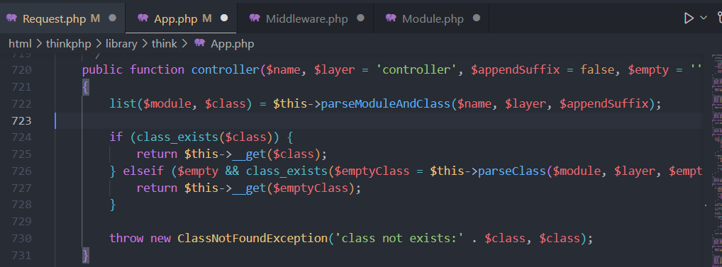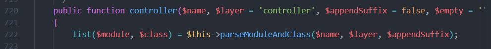 这里判断了下$name里有没有\,如果有就将值赋给$class,然后调用request里的module方法,因为我们的$name是控制器名think\app,显然里面是有\的,所以直接进入这条分支然后返回值。执行完之后我们回到controller方法