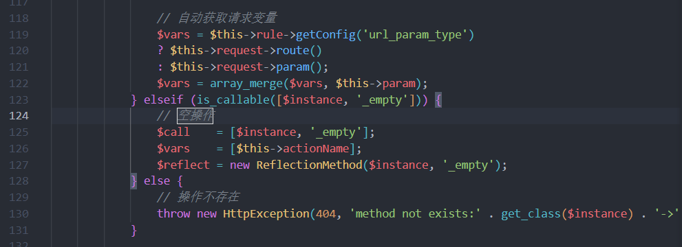 执行完该方法后会判断是否强制路由模式,这也是为什么ThinkPHP的V5的命令执行漏洞很多需要判断是否开启路由模式,因为这里强制执行了判断,不过我们这个版本没开,所以payload能直接打。