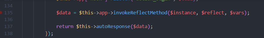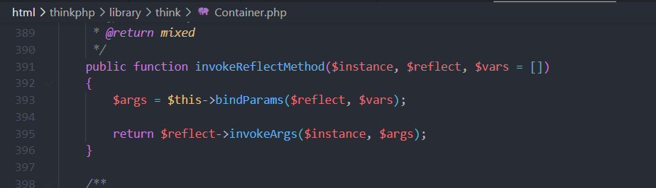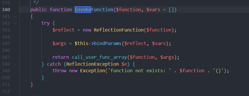 似乎只是起到了一个绑定参数的作用,但他返回了一个invokeMethod($callable, $vars),我们跟一下这个invokeArgs,invokeArgs()函数是PHP中的一个内置函数,用于调用指定的反射方法并返回方法的结果,因此我们接下来会跳转到invokeFunction方法内部。这个invokdefunction方法对应着exp: