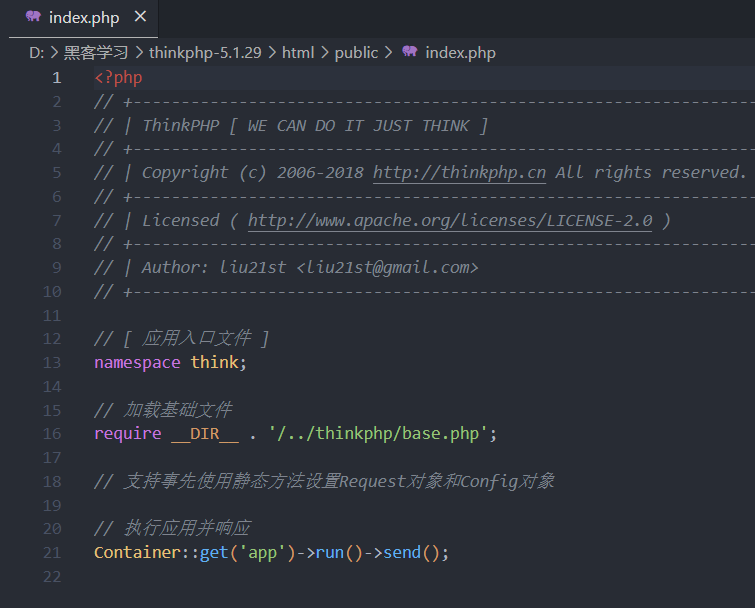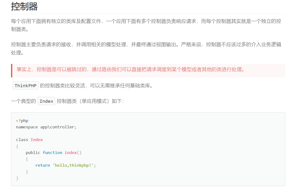 比如我们刚刚安装完成ThinkPHP后访问了一个欢迎页面,上面写着什么”16载初心不改-你值得信赖的PHP框架”(当然,当我们做渗透时,也可以在这里直接看到ThinkPHP的版本,如果直接找不到的话可以访问错误页面,也能看到),事实上当我们查看ThinkPHP的源码,可以看到我们访问的主页面其实是控制器里的一个index方法。并不是像wordpress一样直接www目录下一个index.php文件,它的本质是调用了一个功能,而这个功能返回了html代码,让我们看到了主页上的文字。
