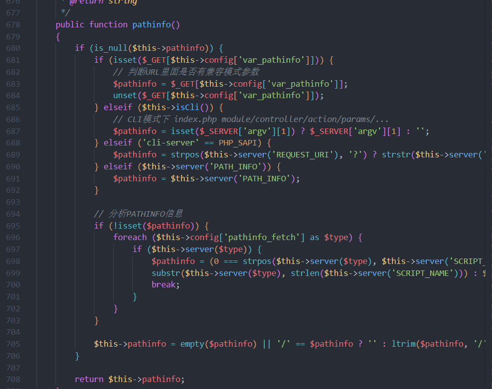 继续寻找pathinfo()方法,这个方法就在上面一点,678行。