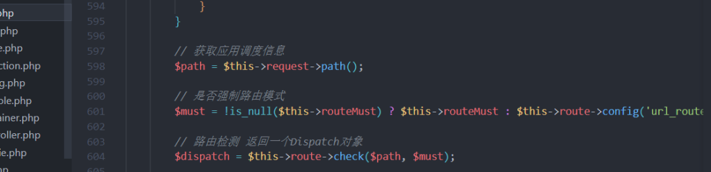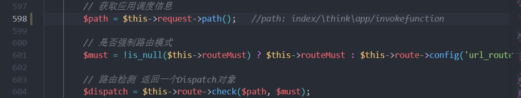 当我们跟进$dispatch = $this->routeCheck()->init();可以在大概598行的位置发现这里获取了应用的调度信息,注释这里写的很简略,从后面我们可以知道,事实上这里应该是调用了pathinfo函数,获取了s参数的值