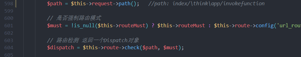 继续看代码,下一步会进行一个路由检测,然后调用了check方法,传入了$path和$must这两个参数,其中path参数的值就是`/index/\̲t̲h̲i̲n̲k̲\app/invokefunc,而must因为默认没开强制路由所以是false