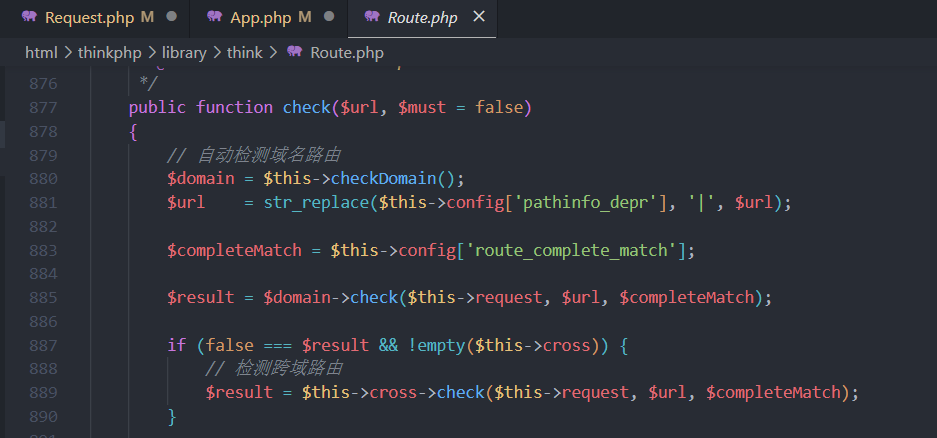 跟进check方法,在library/think/Route.php的877行,我们可以找到check方法,可以看到这里有个强制判断,必须$must=false否则抛出异常,其中$url的值就是我们的s。