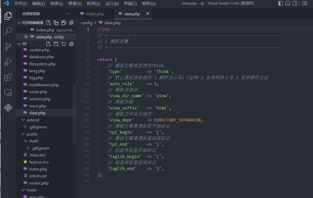 在配置目录的view.php文件中我们需要进行模板引擎相关参数的配置,类似于取别名的操作