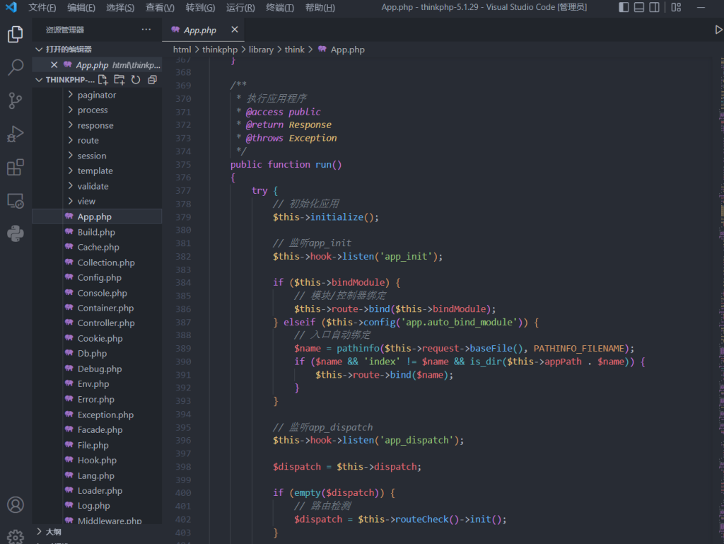 这里App的物理位置是指thinkphp\libray\think目录下的App.php,在这里,我们可以看到run函数的全貌了,也从这里开始,我们正式进入了整个程序的入口。这里一共有六百多行代码,而且有很多的调用和加载,看起来非常头疼,我们直接看到一些关键的函数。