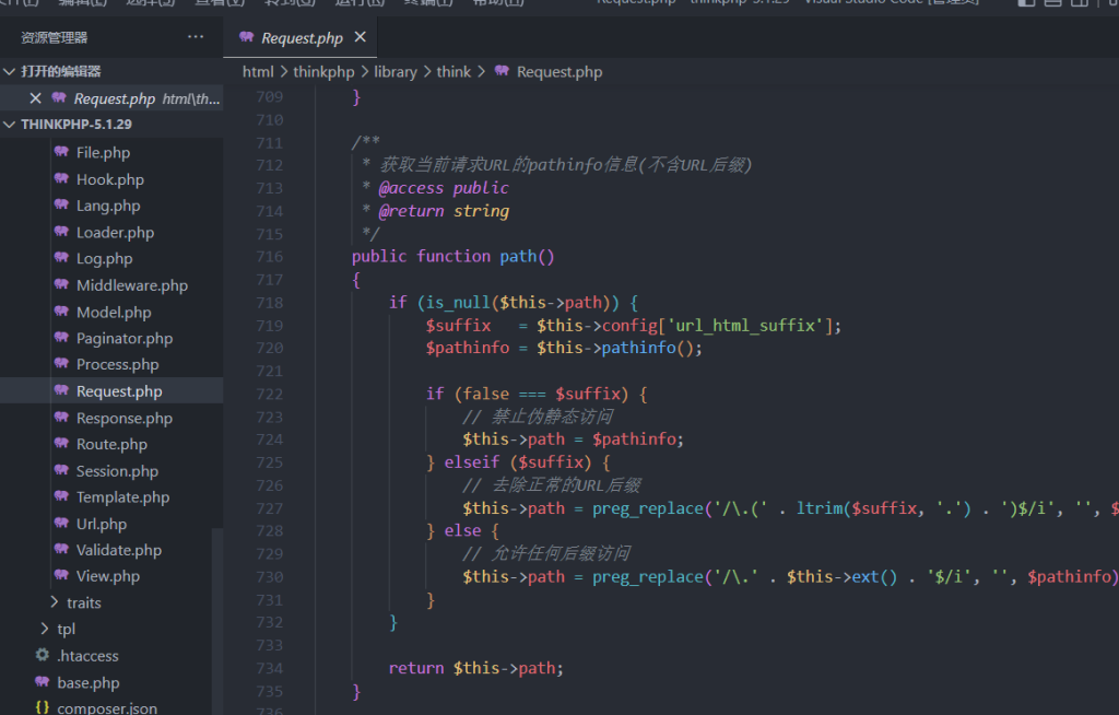 当我们跟进这里的path方法,我们会跳转到Request.php的716行的path方法,我们可以看到这里调用了pathinfo()方法