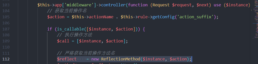 105行这里获取了当前的操作名,然后在112行这里严格获取当前操作方法名,似乎就是new了一个反射方法对象,可能是在这里对操作名做了过滤之类的