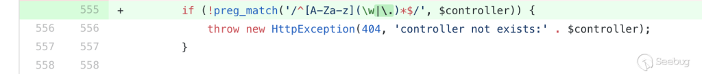 分析出现漏洞的原因,最关键的因素就是ThinkPHP中对$controller没有存在过滤,导致我们可以传入类似于\think\app的控制器,并且可以执行任意类的任意方法。当我们看到ThinkPHP5.0.23以及5.1.31版本,可以看到ThinkPHP官方的补丁主要就是对$controller做了一次过滤,导致我们没法再传入payload中的控制器名。