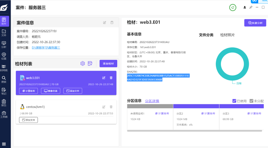 先进入火眼证据分析材料,点击创建案件,创建完之后选择解压出来的这个检材二.E01,这样挂载后我们用火眼平台上的哈希计算工具,这样计算后的SHA256才是真正原始硬盘的SHA256