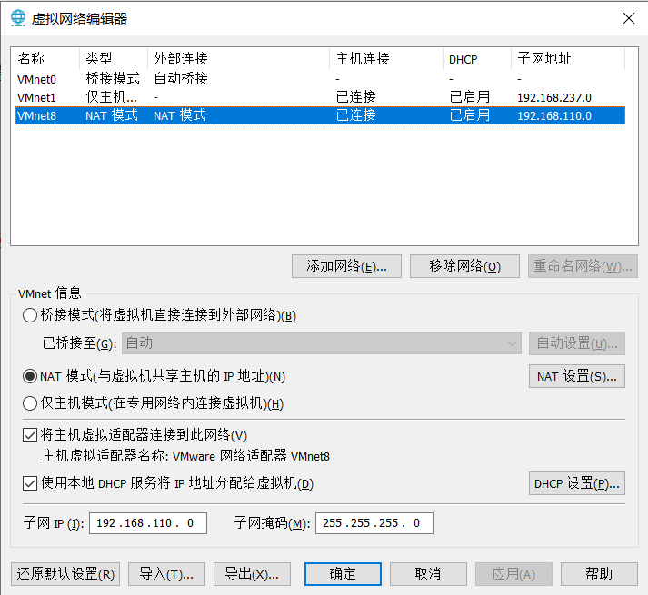 先在vmware那里调虚拟网络编辑器,把最后一个的子网段改成192.168.110.0,这样我们就可以访问宝塔了