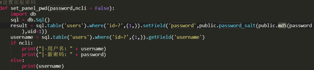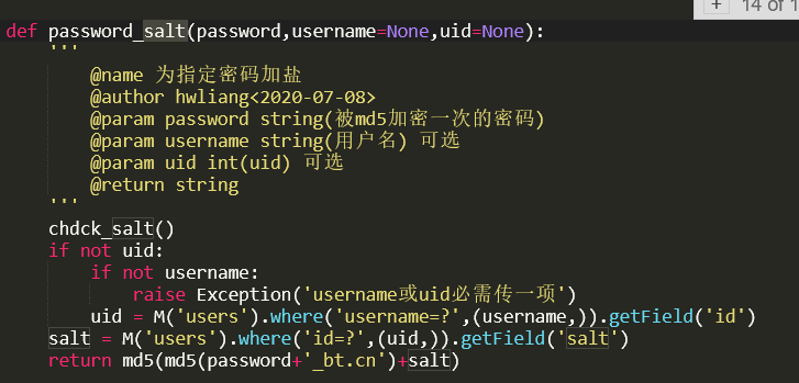 可以看到这里的salt为:M(‘users’).where(‘id=?’,(uid,)).getField(‘salt’),这个东西是从数据库中查询出来的