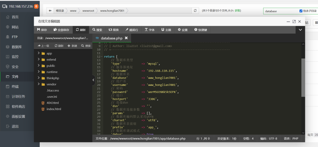 搜索database,找到database.php,可以知道ip为192.168.110.115,密码为wxrM5GtNXk5k5EPX