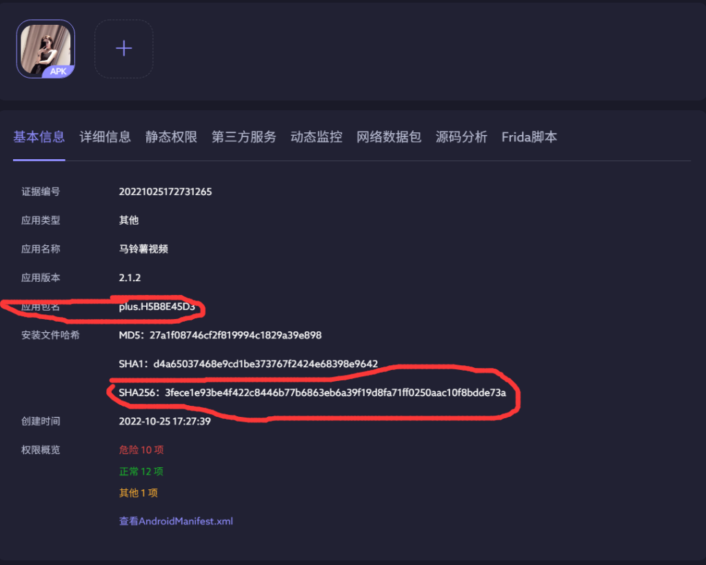 使用雷电APP智能分析分析该apk,可以在基本信息这里查看到SHA256和应用包名