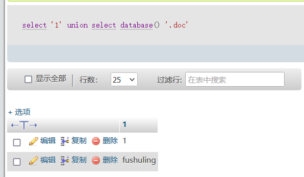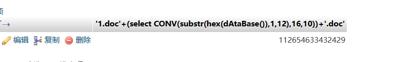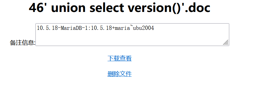 这时后台的查询语句是:select ’43’ union select database() union select ‘.doc’,所以只要存在个43.doc就能满足条件拿到数据了。