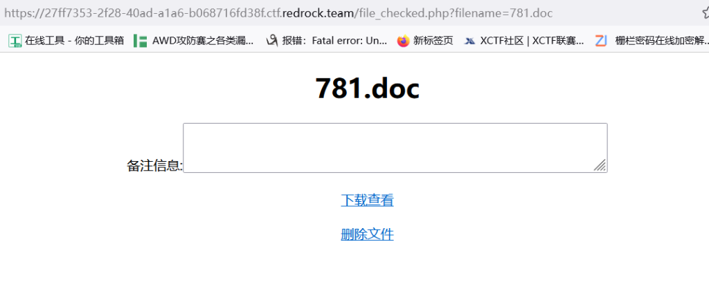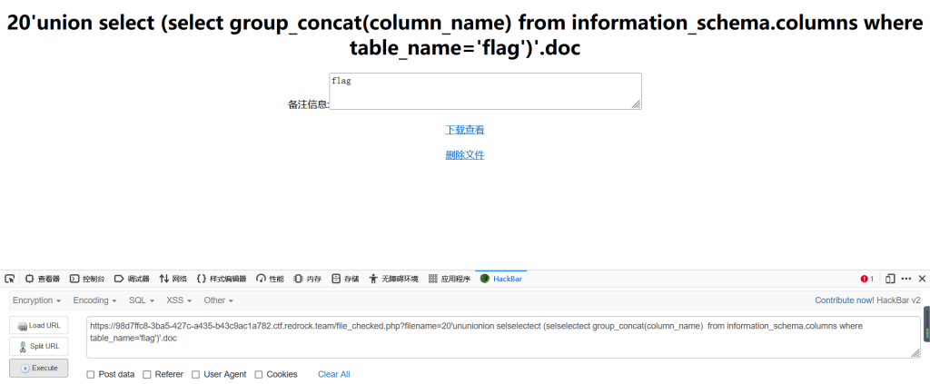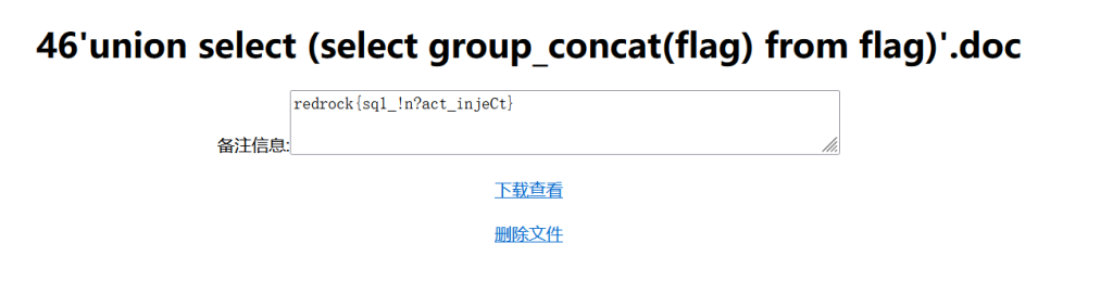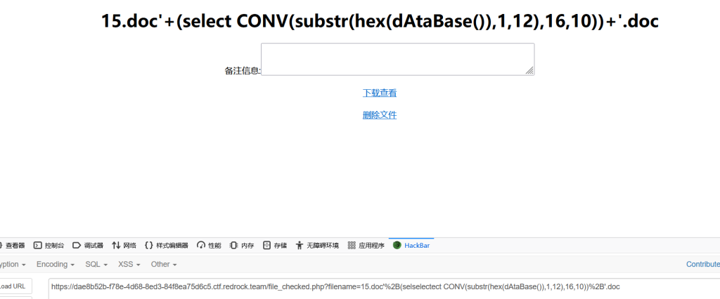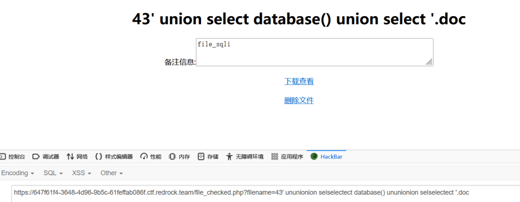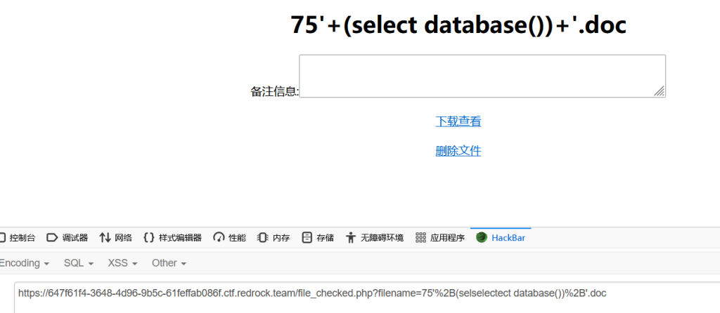 可以看见这个url变成了file_checked.php?filename=781.doc,然后我们就可以下载查看这个文件或者删除这个文件,不过这两个功能其实都没有什么用,点击下载查看只是路径变成/uploads/781.doc这样我们就可以下载这个文件了,而点击删除文件肯定会出现与数据库的交互,所以我思考怎么从这个删除功能拿到我们想要的数据,于是我构造了一下文件名,比如781.doc and select database();.doc,但当我再点击这个文件时意外却发生了: