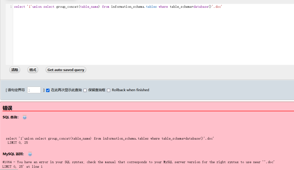 可以看到虽然有报错,但还是执行成功了的,于是我以为这种方法是可以的,于是拿到题目环境里尝试,但是怎么都拿不到数据,最后我本地试了下,这才知道这样是不行的: