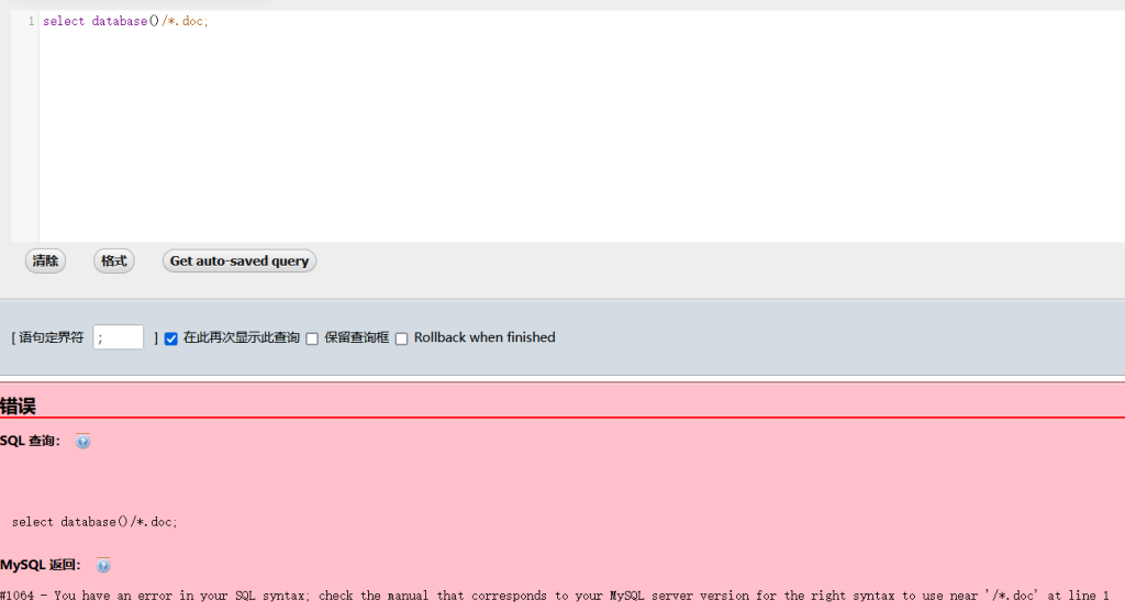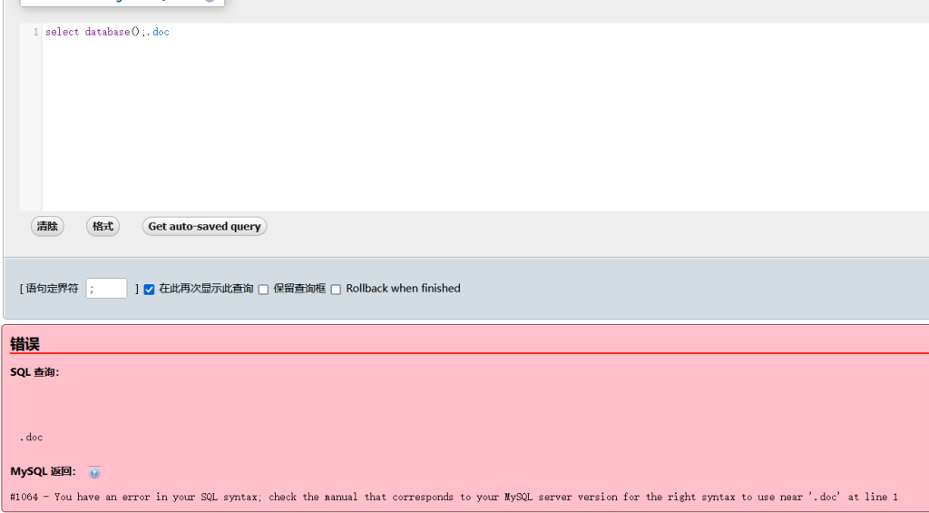 当时我最先想的堆叠注入嘛,所以我先想到的语句是:1.doc’;select database();.doc,当然,我们现在知道数据库里查询的是截取.doc前面那个部分,也就是1,我这个方法就算构造出来肯定也拿不到数据,所以我在这里只是给大家分享一下我的思路,或许能在其他sql注入相关的题目里有所帮助。我当时其实不知道这种用分号直接分割错误语句能不能成功执行,于是我先找了个在线平台试了试: