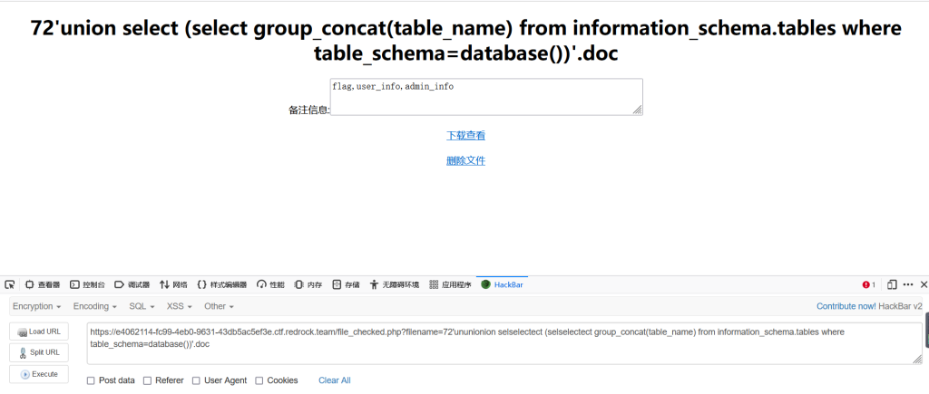 或许很难理解,我这里放出正确答案,我最后成功的构造是1.doc’ union select database() ‘.doc,当然这个构造也不能算绝对正确,至少和预期解不同,这也导致我后面用了其他比较刁钻方法才拿到数据。