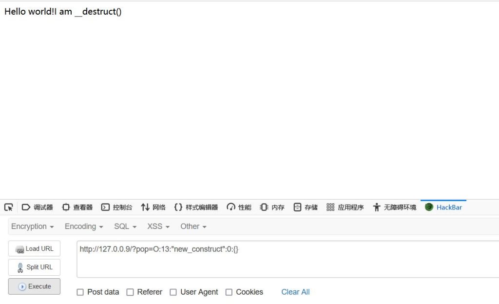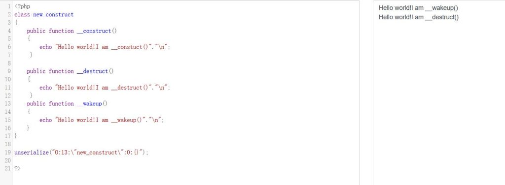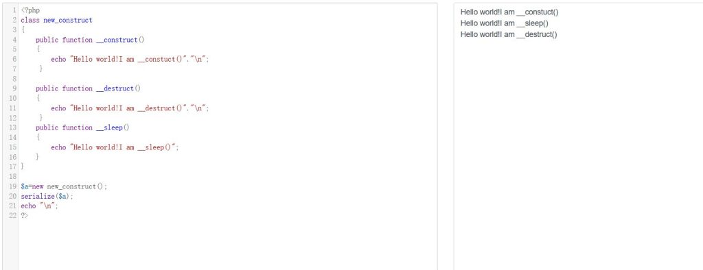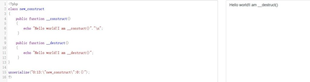可以看到_destruct这个方法会在_construct执行后再执行,因此我们如果new一个对象的话,可以自动执行两种函数,这对我们构造pop链有极大的帮助,而_destruct()在各种和反序列化的题目出现的频率简直是太多了,因为它能被unserialize()自动调用,也因此带动整个pop链,比如下面这个例子: