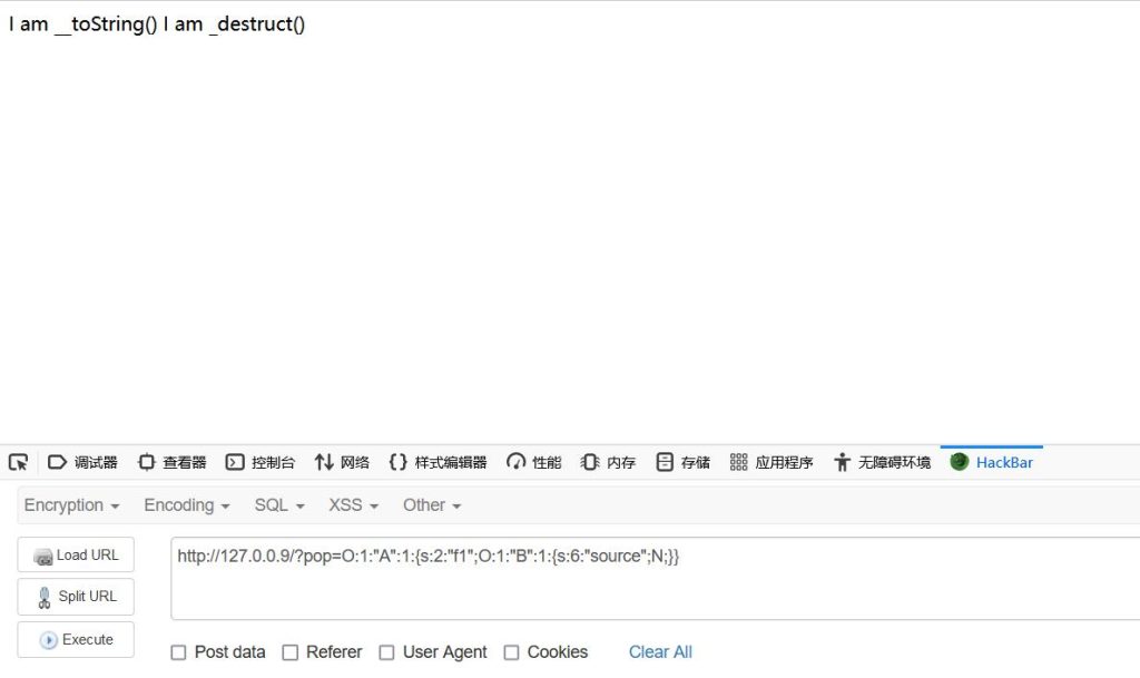 也因此我们原本新创建的对象$a在被serialize()之后变成了一串字符串,而由于网页源码里有一句@unserialize($_GET[‘pop’]);,把我们传进去的序列化过后的字符串又反序列化后生成了对象,这样网页的源代码里就又出现了对象,因此随着对象的销毁就会触发析构函数__destruct()。