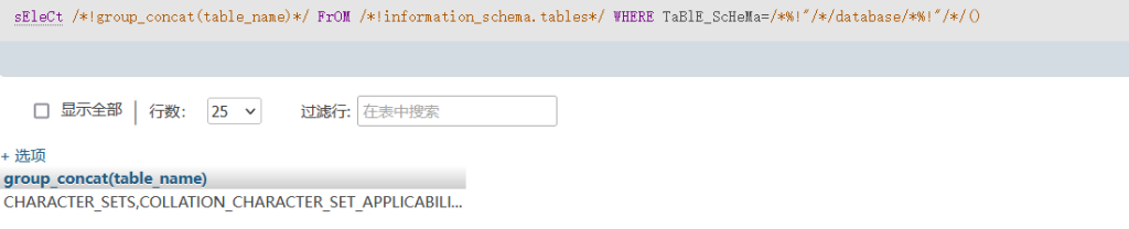 select group_concat(table_name) from information_schema.tables where table_schema = database()他的作用是查表,不用赘述,我们可以把它修改成: