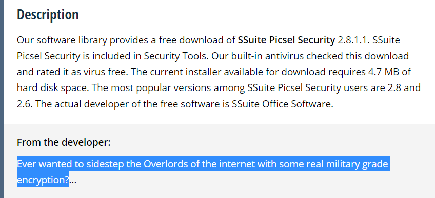 当时是翻外网的时候翻到了一个工具叫做SSuitePicsel,号称是某种军用加密,非常难破解,用谷歌搜了一下发现没人拿这个工具出过题就拿来当签到题了。因为是当签到题,所以当时也没想让大家直接攻击这个加密算法的(没想到大部分人都攻破了,给大伙跪了),因此我直接把那个工具的描述摘抄了一段作为题目的描述了,所以直接谷歌题目描述的那段话是可以直接搜到这个工具的: