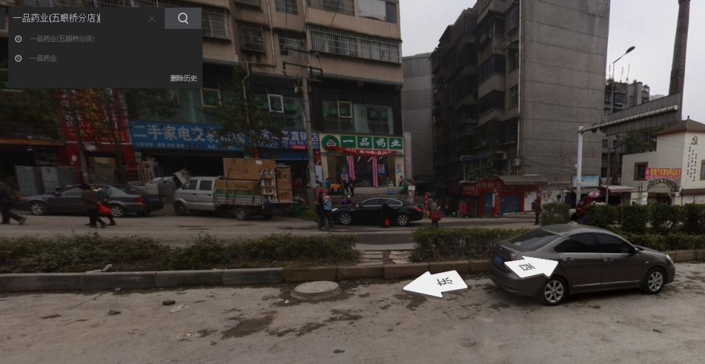 所以我们现在需要排查110米左右有家银行的一品药业即可,最后在53条也就是第二个满足条件的一品药业——一品药业(五眼桥分店)找到正确的百度街景: