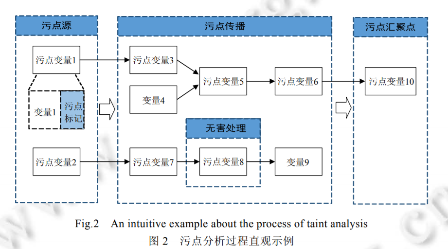 通过上面的模型,现在污点分析转化为分析程序中由污点源引入的数据是否能够不经无害处理,而直接传播到污点汇聚点。如果不能,说明系统是信息流安全的;否则,说明系统产生了隐私数据泄露或危险数据操作等安全问题