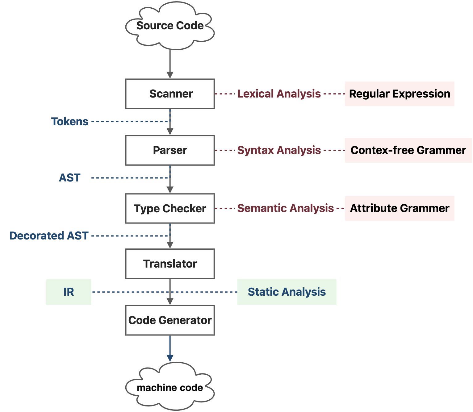 - Translator: 会将抽象语法树翻译成中间表示(Intermediate Representation, IR),IR 的出现解耦了编译器的机器相关(Machine Dependent)部分和机器无关(Machine Independent)部分,上述几个层次在不同架构的机器上面是可以几乎不加改动地复用的。