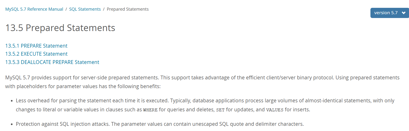 MySQL 5.7 提供了对服务器端预处理语句的支持。此支持利用了高效的客户端/服务器二进制协议。使用带有占位符的预处理语句作为参数值具有以下好处: