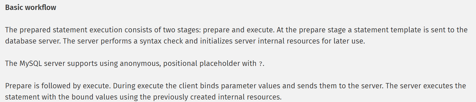 准备好的语句执行包括两个阶段:准备和执行。在准备阶段,语句模板被发送到数据库服务器。服务器执行语法检查并初始化服务器内部资源以供稍后使用,同时 MySQL 服务器支持使用匿名位置占位符?。而准备之后是执行,在执行期间,客户端绑定参数值并将其发送到服务器。服务器使用先前创建的内部资源执行具有绑定值的语句。