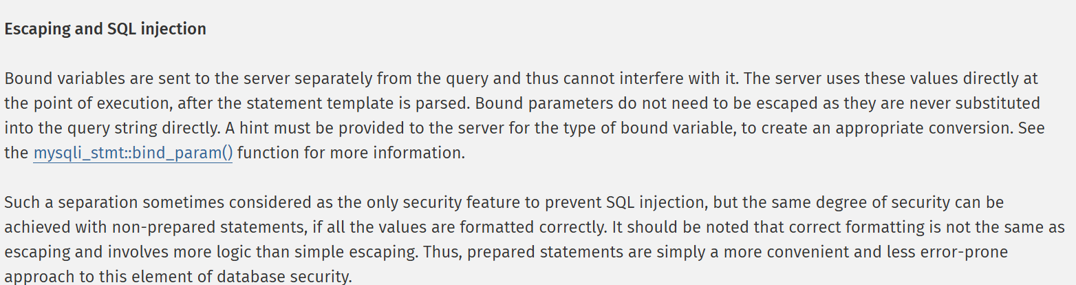 这里也提到了,绑定变量与查询分开发送到服务器,因此不会干扰查询。在解析语句模板后,服务器在执行时直接使用这些值。绑定参数不需要转义,因为它们永远不会直接替换到查询字符串中。必须向服务器提供绑定变量类型的提示,以创建适当的转换。